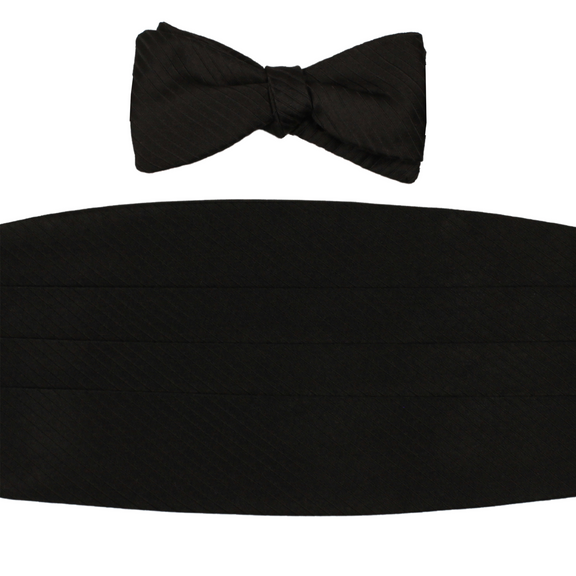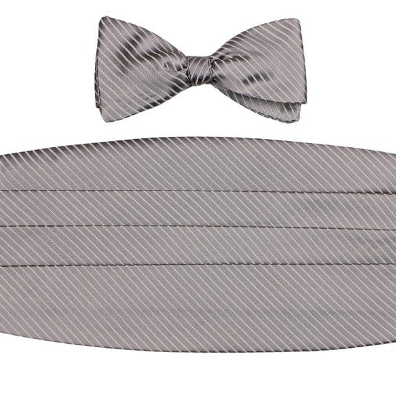 Our Striped Silk Formalwear Set is handmade in America from 100% silk. Our set comes with either a self-tied or pre tied bow tie and a matching cummerbund. As these products are made to your specifications in our factory, returns are generally not accepted. Our formalwear sets usually ship the next business day.