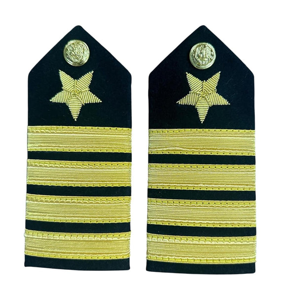 These shoulder boards feature 2% gold lace and hand embroidered bullion devices. Currently available in ENS to CAPT, each set is hand made overseas from the finest materials. These go great with our matching 2% gold lace chinstraps and hand embroidered cap devices for both Navy and Coast Guard.